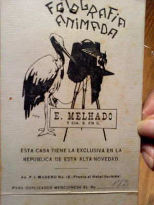Desde hace tiempo me había intrigado un anuncio de Eduardo Melhado, de 1916, donde el fotógrafo y editor dejaba entrever su exclusividad para hacer fotos en "movimiento". Al preguntarle a José Antonio Rodríguez, editor de Alquimia, sobre estas imágenes me comentó que las conocía. Ayer me enseñó tres de estas fotografías casi tamaño postal y cubiertas con una montura de cartulina. La "fotografía animada" tiene el mismo principio de las imágenes lenticulares las cuales, al girarse, se ve la imagen moverse. Pero estas fotografías de Eduardo Melhado tienen una tira a la derecha de la cartulina para jalar y regresar a su posición original la imagen. De estas forma tan ingeniosa se ve cómo cambian de gestos los retratados.